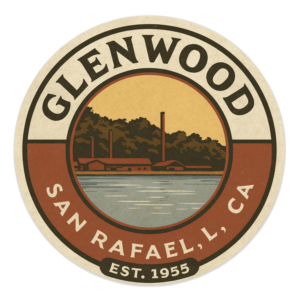 Show your neighborhood pride with this vintage-style Glenwood sticker, celebrating San Rafael’s iconic roots since 1955.  Featuring a timeless circular design with weathered textures and a bold, nostalgic illustration of the historic McNear’s Brickyard along the bay, this durable sticker is perfect for water bottles, laptops, bumpers, or wherever you want to rep Glenwood with classic NorCal flair.